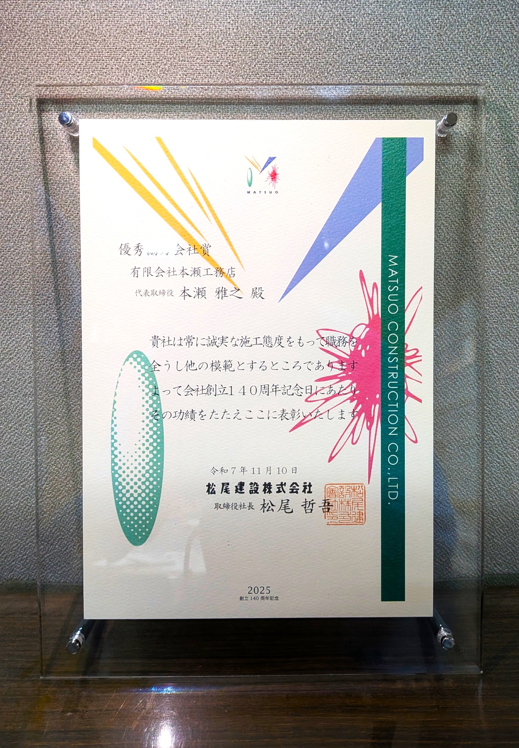 通信会社のエクシオ様から、昨年度の工事実績として優良施工班賞を頂きました。社員の施工能力や安全技術を評価され、大変うれしく思います。今後も各現場で高品質施工、安全第一を目標に頑張っていきます。